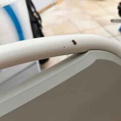 Dette er en utstillingsstol som har vært brukt på utstillinger, og selges derfor til redusert pris. Stolen fremstår ellers i svært god stand, men har en liten kosmetisk skade i lakken på stangen ved fotstøtten, som vist på bildet.